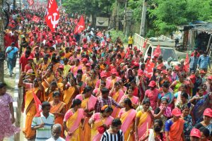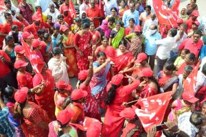 మిర్యాలగూడ సిపిఎం అభ్యర్థి జూలకంటి రంగారెడ్డి నామినేషన్ సందర్భంగా శుక్రవారం ఎర్రదండు కదిలింది. నియోజవర్గ వ్యాప్తంగా స్వచ్ఛనంగా వేలాది మంది ప్రజలు తరలివచ్చి ఎర్ర జెండా నినాదాలు చేశారు.తామేమీ తక్కువ కాదంటూ ఎర్రజెండాలు చేతబట్టి టీ షర్టులు చీరలు కట్టుకొని భారీ ర్యాలీ నిర్వహించారు. హనుమాన్ పేట ఫ్లైఓవర్ బ్రిడ్జి నుండి శకుంతల థియేటర్ ఆర్టిసి బస్టాండ్ పొట్టి శ్రీరాములు సెంటర్ అంబేద్కర్ చౌరస్తా రాజీవ్ చౌక్ మీదుగా ఆర్డీవో కార్యాలయం వరకు వేలాది మందితో ర్యాలీ నిర్వహించారు. సుమారు కిలోమీటర్ మేరకు ర్యాలీ సాగింది. ర్యాలీ జరుగుతున్న సమయంలో కార్మికులు, హమాలీలు, పూల, పండ్ల వ్యాపారులు ఎదురెళ్లి పూలమాలలతో ఘనంగా సన్మానించారు.పండ్ల వ్యాపారి మహమ్మద్ షకీల్ ఆధ్వర్యంలో గజమాలవేసి అభిమానాన్ని చాటుకున్నారు.