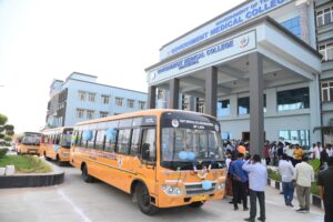 ప్రభుత్వం వైద్య రంగాన్ని బలోపేతం చేస్తూ ప్రభుత్వ వైద్య కళాశాలలలో వైద్య విద్య అభ్యసిస్తున్న విద్యార్థుల కొరకు సకల సదుపాయాలు కల్పించడం జరుగుతుందని పెద్దపల్లి పార్లమెంటు సభ్యులు గడ్డం వంశీకృష్ణ అన్నారు. శుక్రవారం జిల్లాలోని హాజీపూర్ మండలం గుడిపేట ప్రాంతంలో గల ప్రభుత్వ వైద్య కళాశాల విద్యార్థుల కొరకు ఏర్పాటుచేసిన బస్సులను జిల్లా కలెక్టర్ కుమార్ దీపక్, ప్రభుత్వ వైద్య కళాశాల వైస్ ప్రిన్సిపాల్ లు రేఖ, జగతీ దేవి కలిసి ప్రారంభించారు. ఈ సందర్భంగా పార్లమెంట్ సభ్యులు మాట్లాడుతూ ప్రభుత్వ వైద్య కళాశాల విద్యార్థులకు ఎలాంటి అసౌకర్యం కలగకుండా సదుపాయాలు కల్పించడం జరుగుతుందని తెలిపారు. ఎం.పి. నిధుల నుండి 2 బస్సులు, డి. ఎం. ఎఫ్. టి. నిధుల నుండి 1 బస్సు మొత్తం 80 లక్షల రూపాయలతో ఏర్పాటు చేయడం జరిగిందని తెలిపారు. దేశంలోని ఇతర ప్రాంతాల నుండి వచ్చి వైద్య విద్య అభ్యసిస్తున్నారని, వైద్య విద్య అనేది ప్రత్యేకమైనదని తెలిపారు. చదువుకోవడం అనేది ప్రతి ఒక్కరి హక్కు అని, ఉన్నత చదువులు అభ్యసించి ఆదర్శంగా నిలవాలని, ఉన్నత స్థాయిలో ప్రజలకు సేవ అందించడం బాధ్యతగా తీసుకోవాలని తెలిపారు. ఈ ప్రాంత అభివృద్ధి కొరకు వచ్చిన ప్రతి అవకాశాన్ని వినియోగించుకోవడం ద్వారా ప్రజా సమస్యల పరిష్కారంపై దృష్టి సారించడం జరుగుతుందని తెలిపారు.
